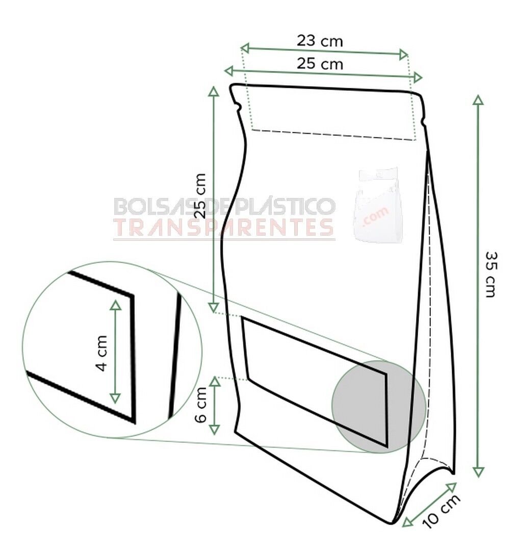 Bolsas de papel kraft standup 25×35+10 cm con ventana y autocierre zip. Perfectas para café y productos gourmet de gran formato.