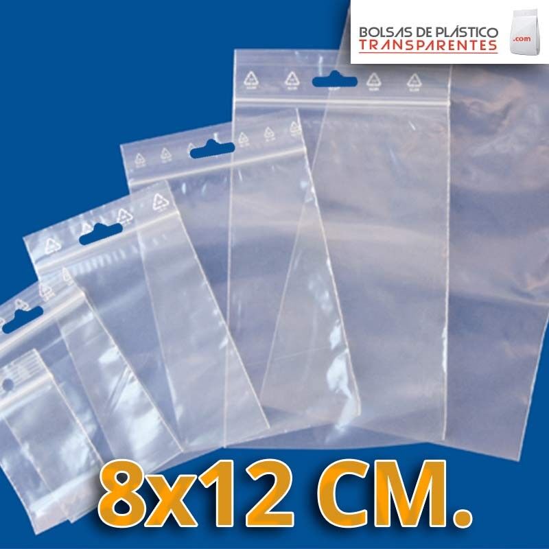 Bolsas de plástico transparentes 8×12 cm en polietileno galga 200 con autocierre zip reutilizable y eurotaladro para colgar en expositor profesional. Resistentes y perfectas para retail y ferretería.