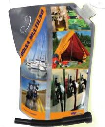 Bolsas portalíquidos , fabricadas en polietileno laminado con alta resistencia compuesto por una lámina de copolímero y otra mas de polipropileno. Son de alta resistencia al pinzamiento y al desgaste, además resistente a pequeños golpes. Tiene cierre con tapón de rosca, dando la garantía de estanqueidad y lleva también una asa para su transporte. Va impresa y también lleva euro-taladro para poder colocarla en expositores de tiendas, en especial de gasolineras.
