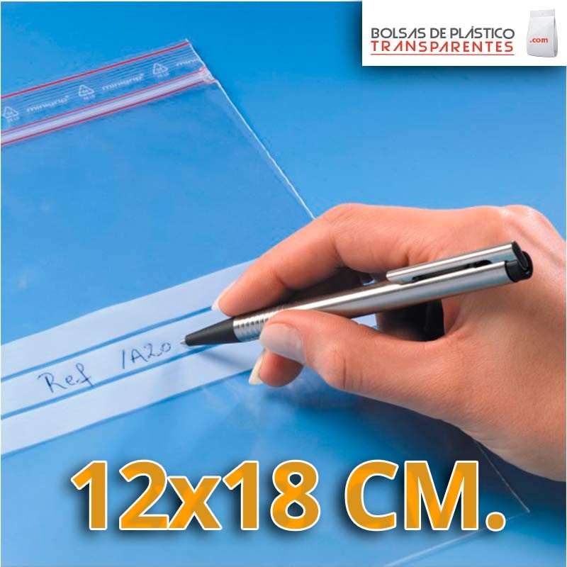 Bolsas de plástico transparentes 12×18 cm en polietileno galga 200 con autocierre zip reutilizable y banda de escritura para identificación y clasificación profesional.